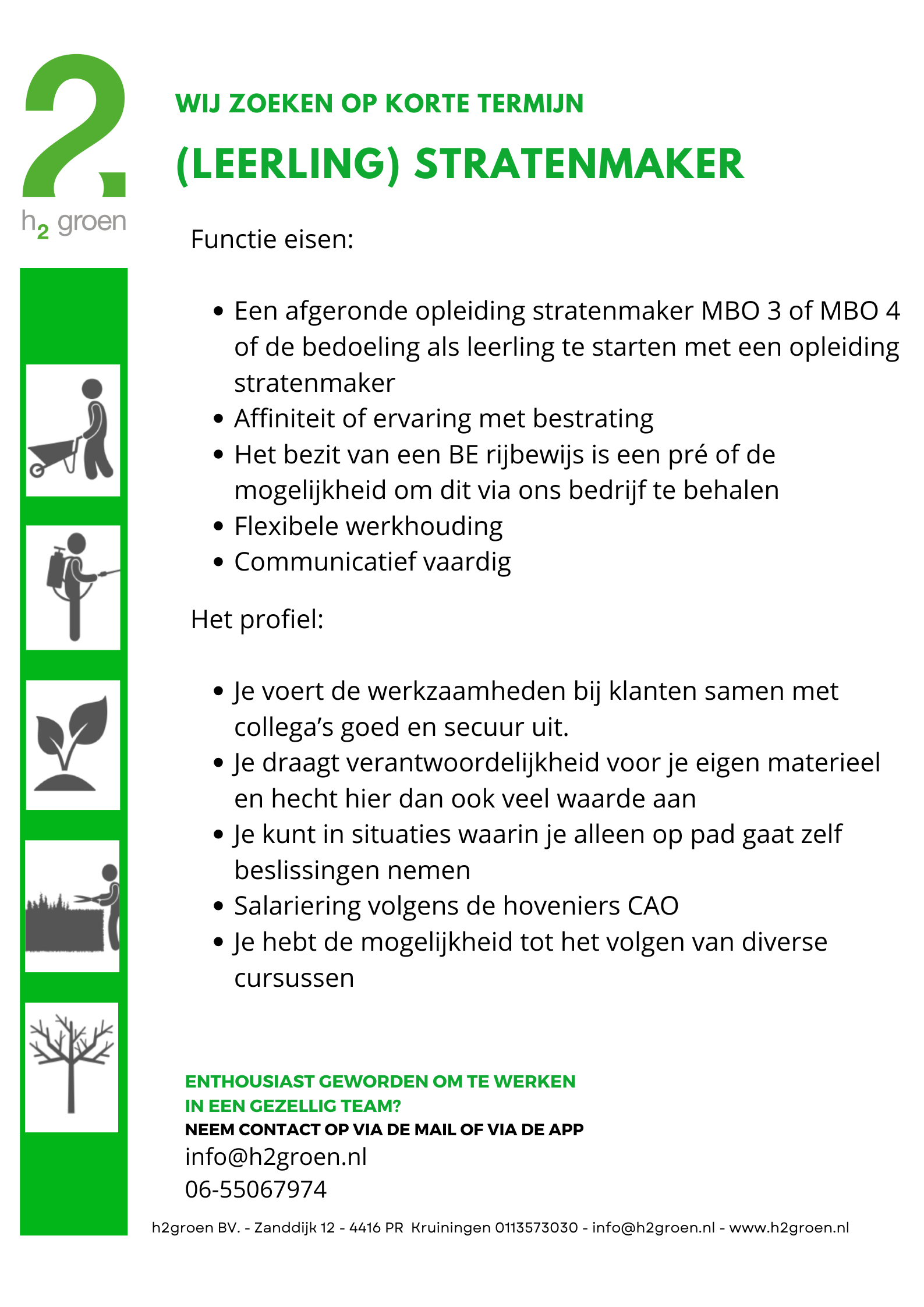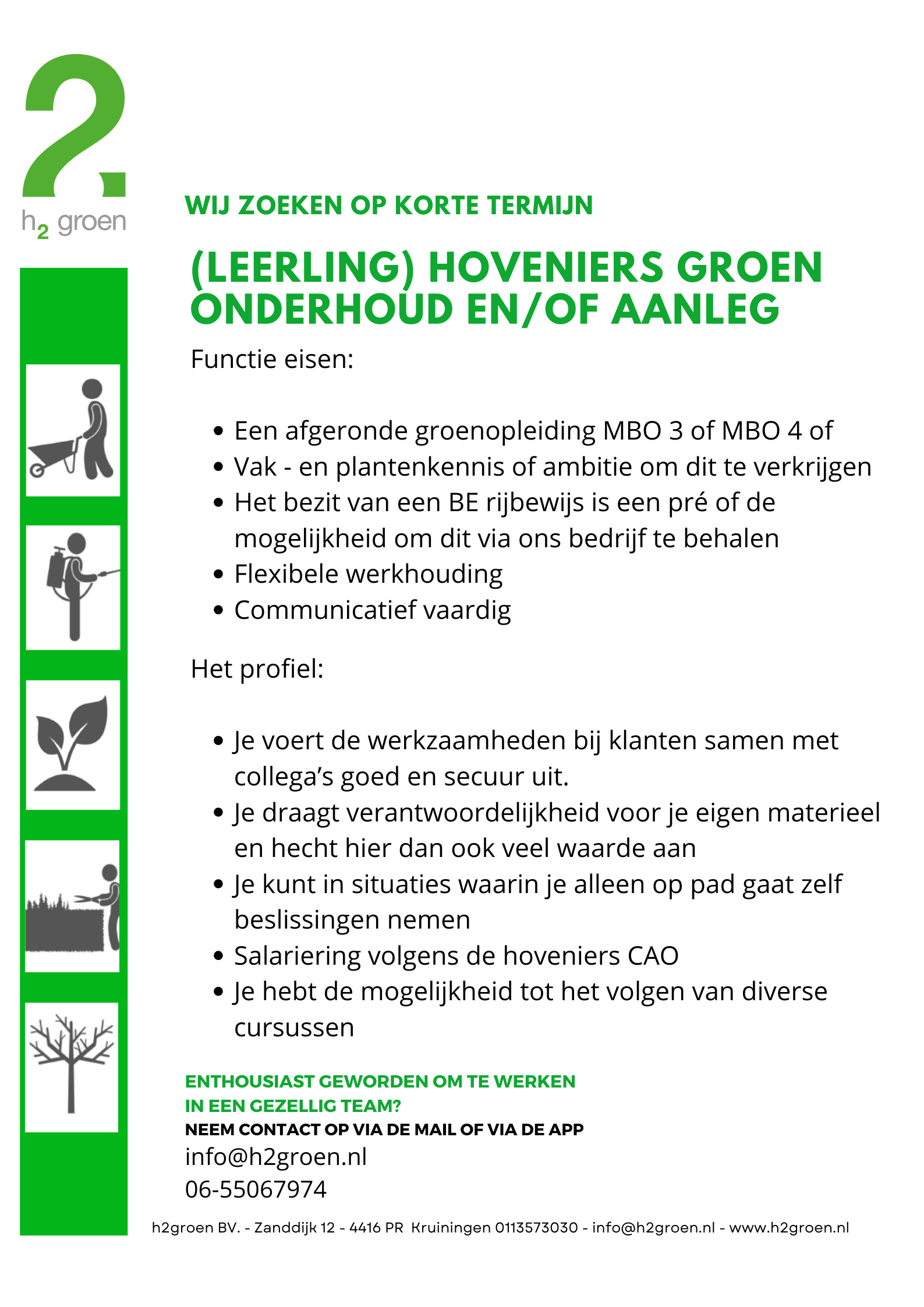 Bij h2 groen bieden we de mogelijkheid voor leerlingen om te komen werken en leren. Wij leiden graag jongeren op tot professionals. Daarnaast bieden wij stageplekken aan op verschillende niveau’s en functies. Dus ben jij opzoek naar een leerbedrijf waarin je alle kneepjes van het vak leert? Bel of mail ons gerust of stuur een appje naar: 06-55067974